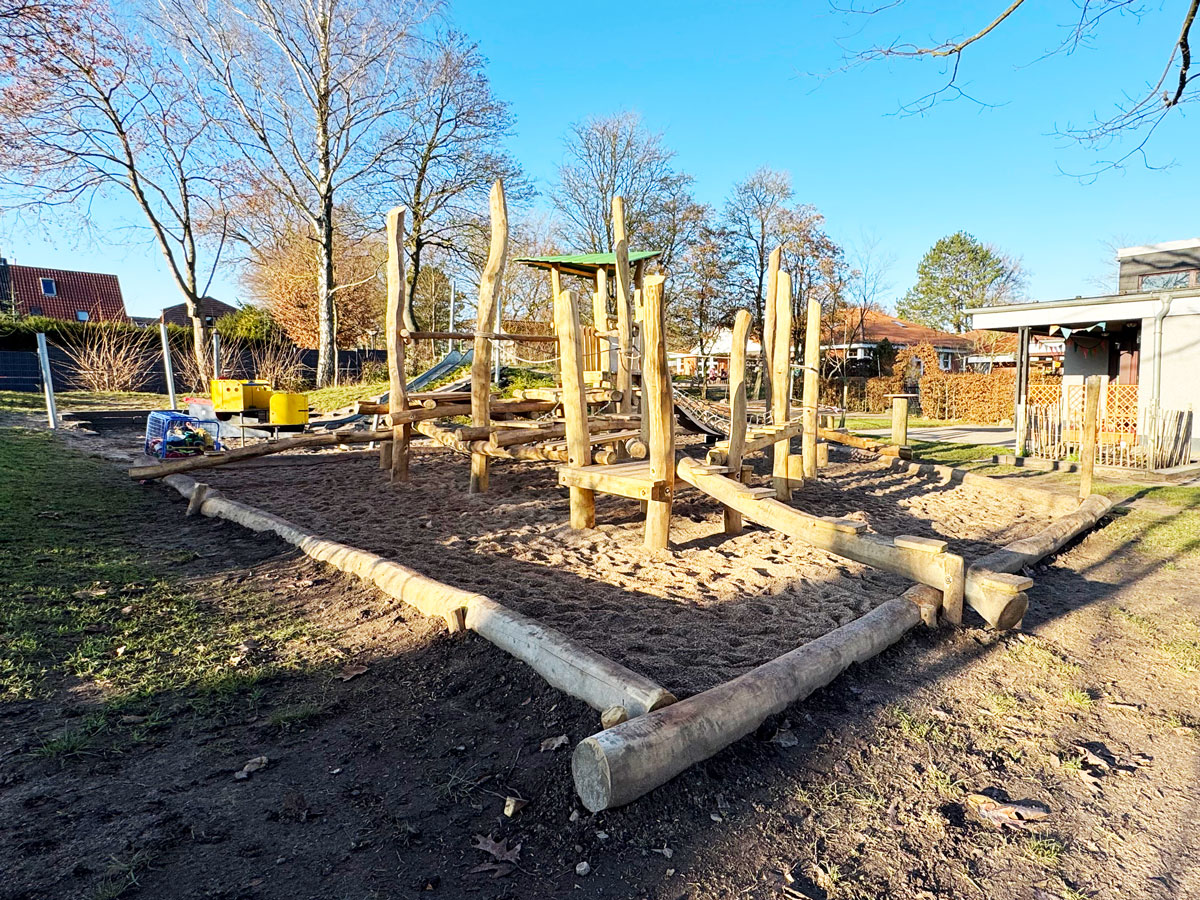 Die Leitung sprach uns mit dem Wunsch an, die in die Jahre gekommene alte Spielanlage zu ersetzen. Wir haben das Thema Klettern und Balancieren ohne zwangsweise vorgegebene Bewegungsabläufe, inklusive einer Rutsche vorgeschlagen. Das vielseitige Angebot wurden in guter Kooperation mit der Firma Heinz Scharnweber gemeinsam umgesetzt. Die Kinder haben diese Kletter- und Balancieranlage sehr gut angenommen.