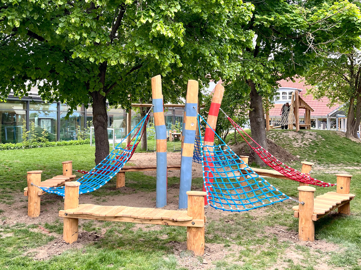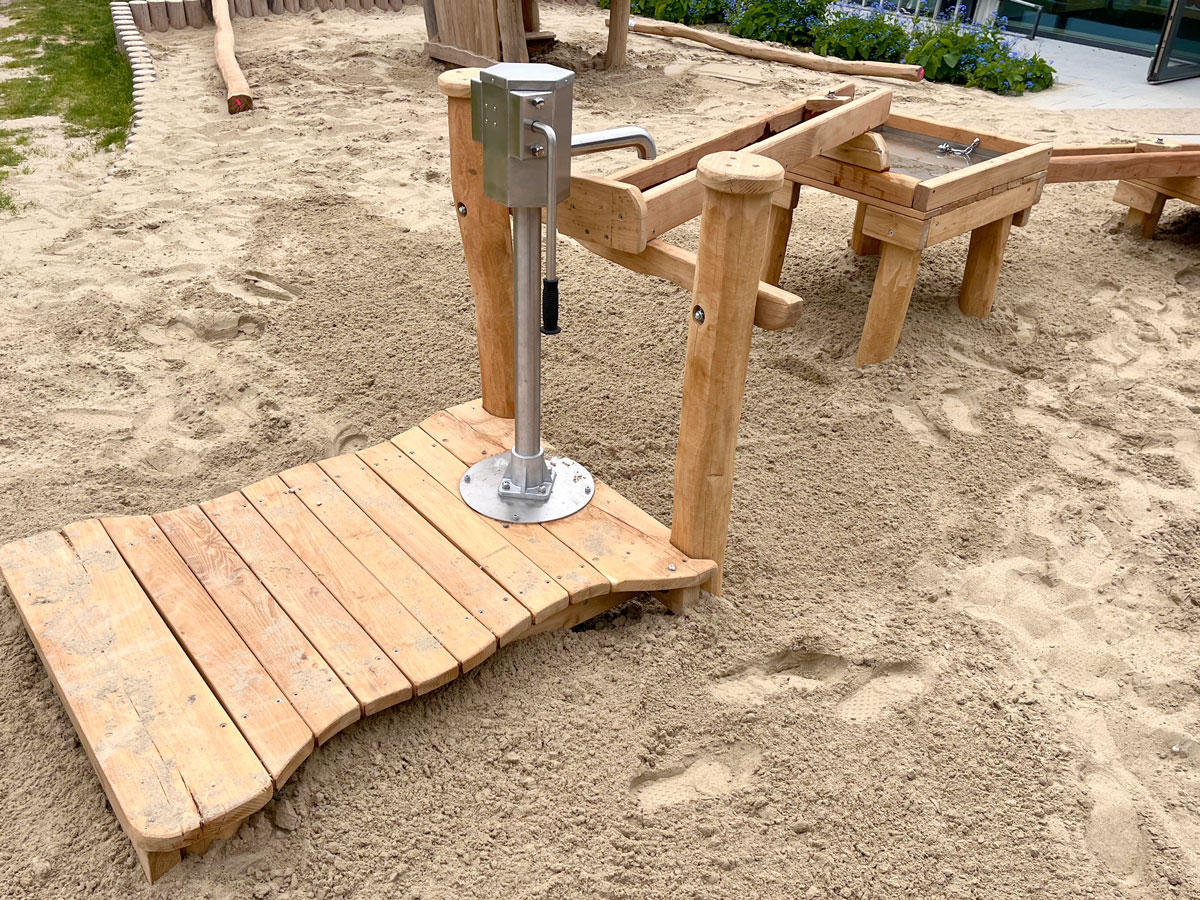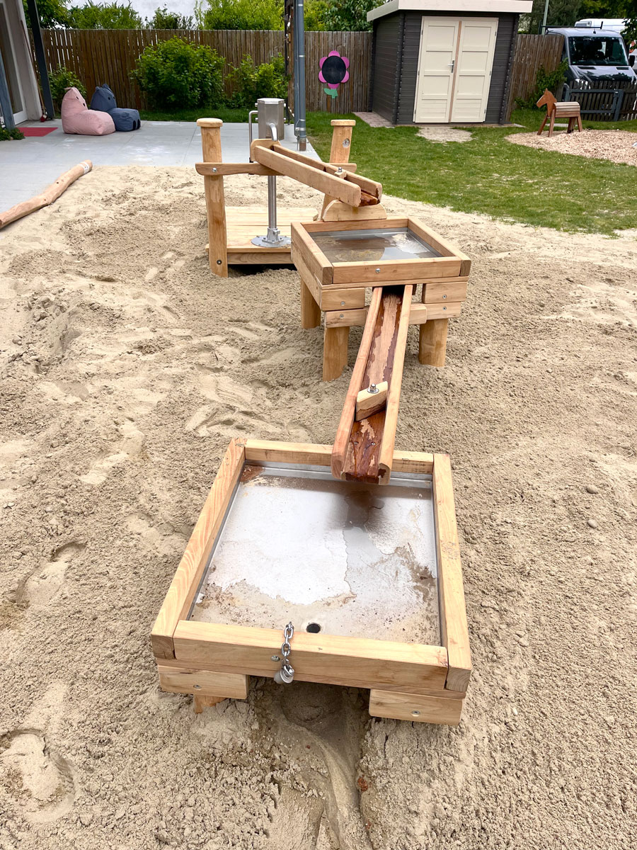 Im Mai 2025 wurden zahlreiche Spielgeräte für den Elementarbereich von uns hergestellt und durch uns vor Ort, in sehr guter Kooperation mit dem regionalen Gartenbauunternehmen, eingebaut und montiert. Unter anderem das Spielhaus 'Kolmar', ein RoundPan®, die Wasser-Matschanlage 'Alster', eine Doppelschaukel 'Zwiesel', eine Hügelspielanlage und Sandspielrahmenhölzer.