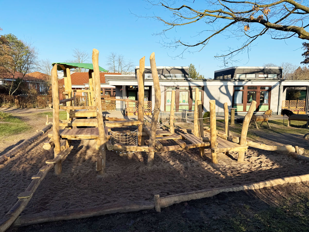Die Leitung sprach uns mit dem Wunsch an, die in die Jahre gekommene alte Spielanlage zu ersetzen. Wir haben das Thema Klettern und Balancieren ohne zwangsweise vorgegebene Bewegungsabläufe, inklusive einer Rutsche vorgeschlagen. Das vielseitige Angebot wurden in guter Kooperation mit der Firma Heinz Scharnweber gemeinsam umgesetzt. Die Kinder haben diese Kletter- und Balancieranlage sehr gut angenommen.
