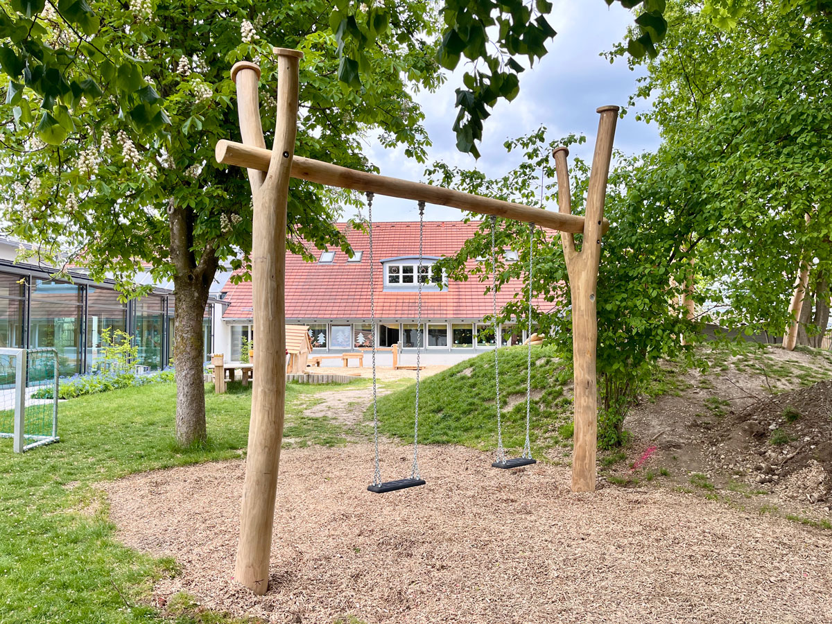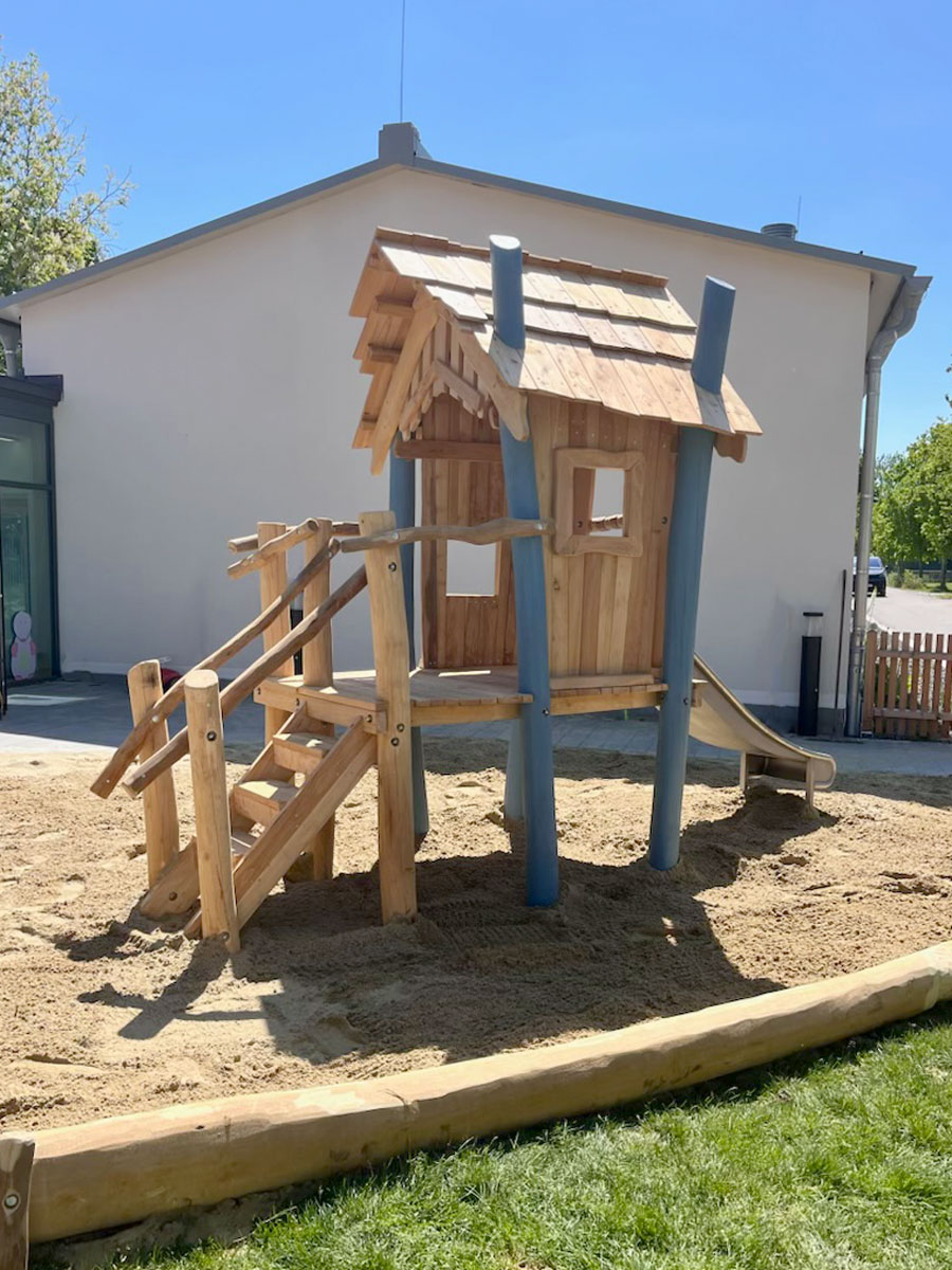 Im Mai 2025 wurden zahlreiche Spielgeräte für den Elementarbereich von uns hergestellt und durch uns vor Ort, in sehr guter Kooperation mit dem regionalen Gartenbauunternehmen, eingebaut und montiert. Unter anderem das Spielhaus 'Kolmar', ein RoundPan®, die Wasser-Matschanlage 'Alster', eine Doppelschaukel 'Zwiesel', eine Hügelspielanlage und Sandspielrahmenhölzer.