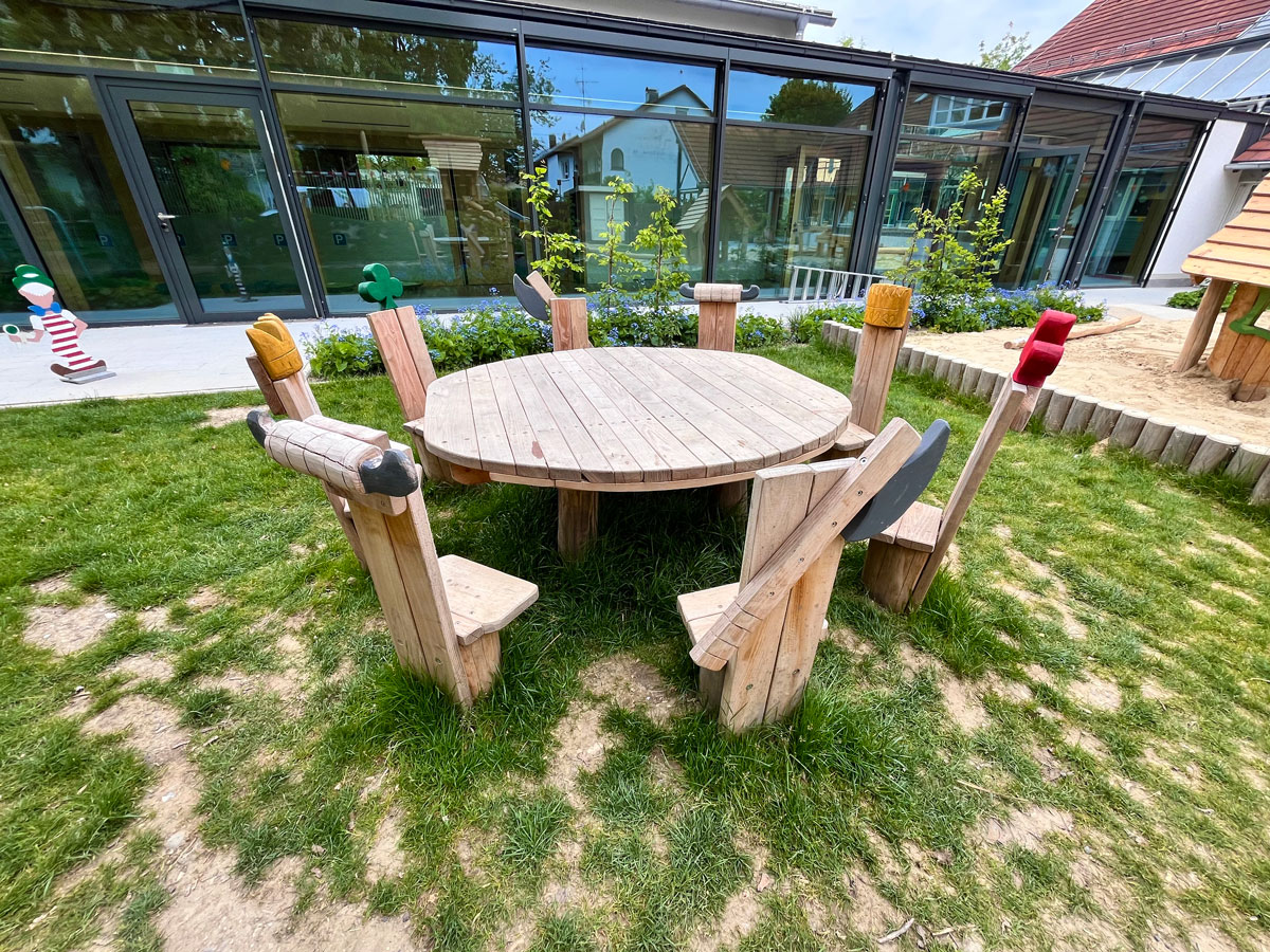 Im November 2024 lieferten wir für den U3-Spielbereich kleine Sitzgruppen, unsere Artustafel, das Spielhaus 'Schafstall', eine Wasser-Matschanlage, eine U3-Bauchschaukel und das Spielhaus Hexe. Die Spielgeräte wurden durch den Auftraggeber eingebaut und montiert.